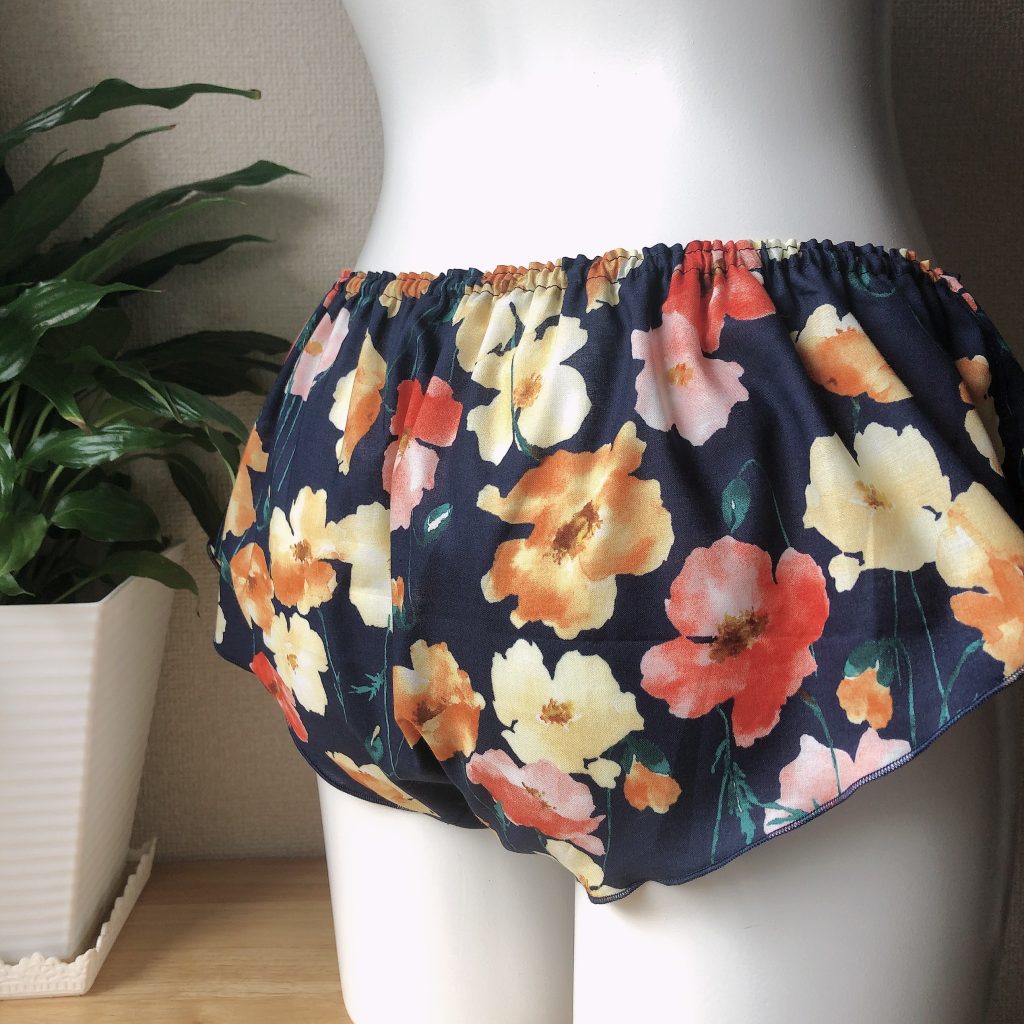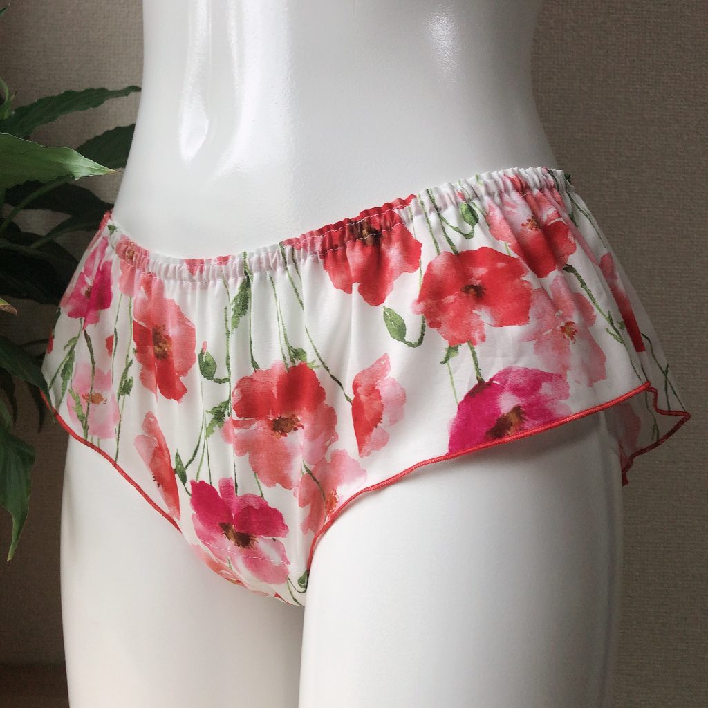 人気のポピー生地のブルー、残りショーツ一枚とお伝えしておりましたが、最後のオーダーをいただきましたのでsold outです。
