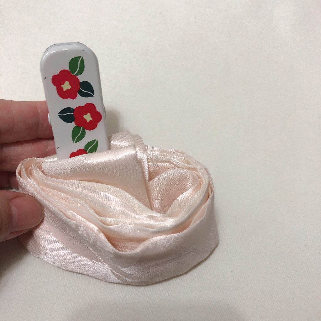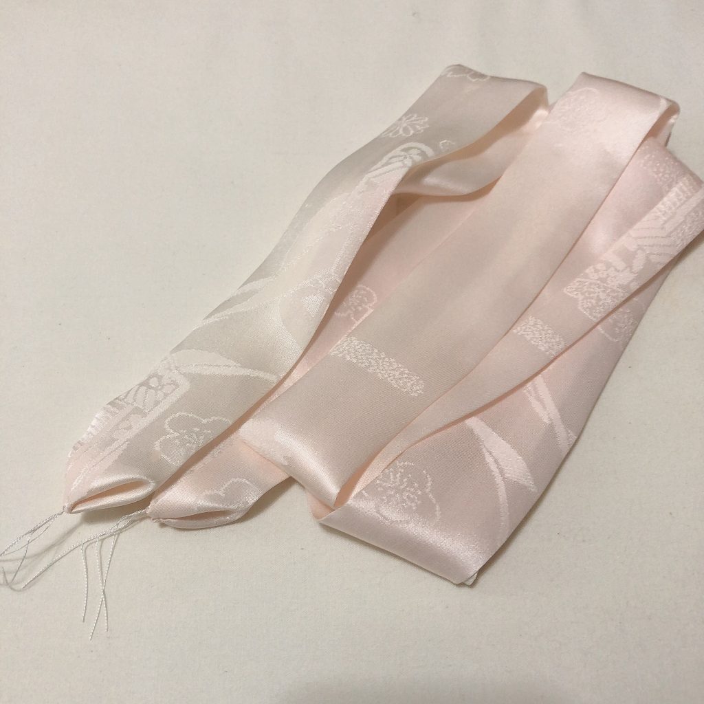 普通の腰紐より短くて、ツルツル滑る絹で作っています。