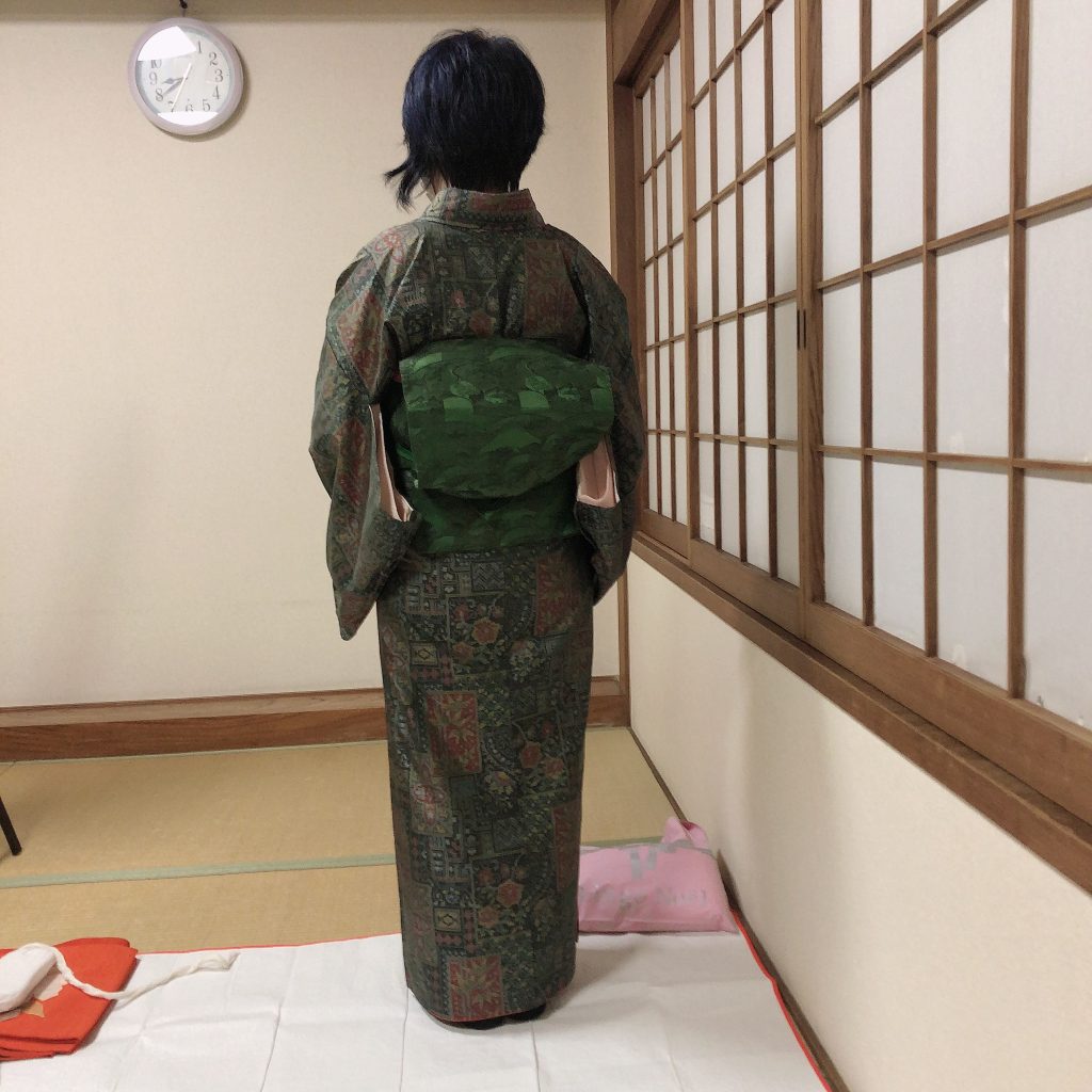 アップにすると粗が沢山見えてしまいますが、ぎゅうっと帯を結んでしまうので、傷まないかとドキドキしながらの工程でした。