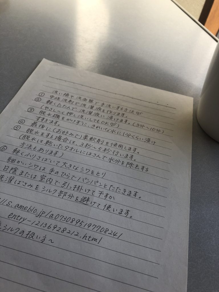 シルクは、お洗濯の方法もよく聞かれるので、手書きで手洗いの方法を書いたものを同封することが多いです。