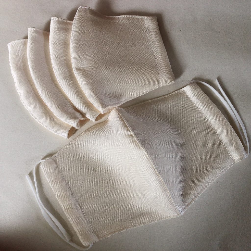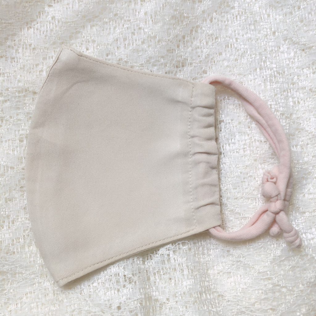 あ、ちなみに、私が使っているマスクはマスク用のゴムを使わず、コットン100%のTシャツヤーンを使用しています。(写真一番上のマスクのピンクベージュの紐参照。お客様用は白系です)