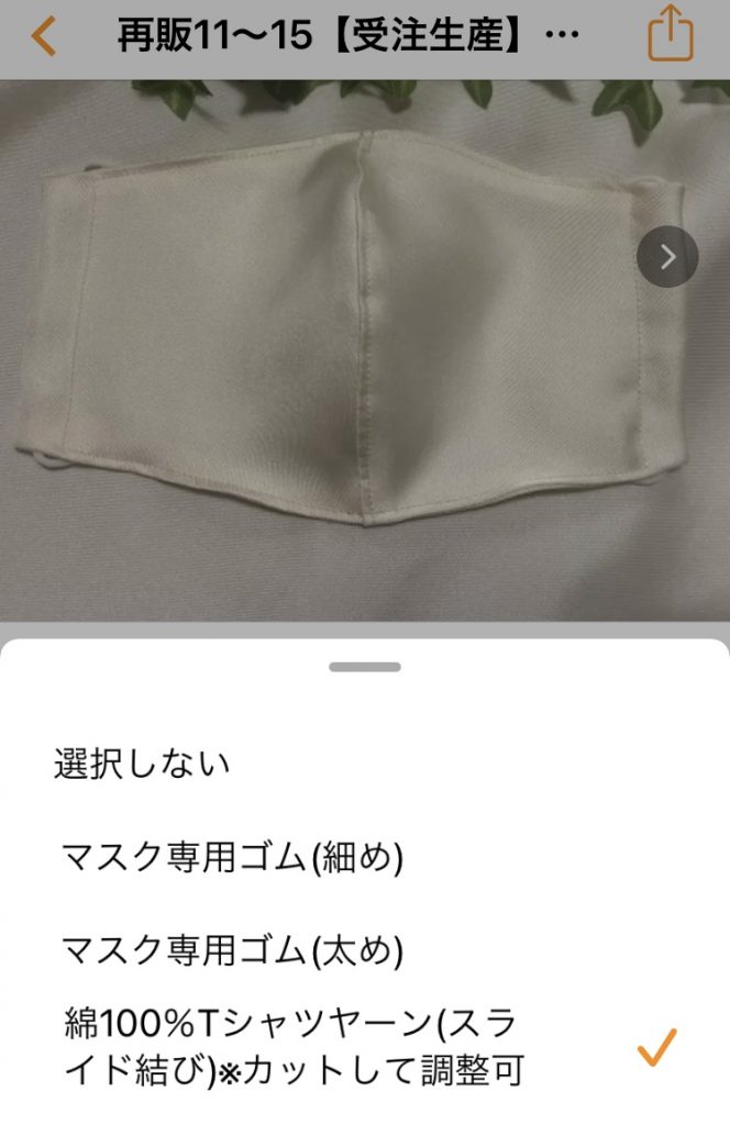 上に、マスクのサイズ選択があって、その選択のあと、下のマスクの耳かけ部分をご選択ください。